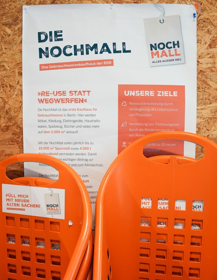 Die NochMall ist das erste Kaufhaus für Gebrauchtwaren in Berlin, was viel mehr ist als ein Secondhand-Kaufhaus. In der NochMall werden nicht nur Möbel, Kleidung, Elektrogeräte, Haushaltswaren, Spielzeug, Bücher und vieles mehr auf über 2.000 Quadratmetern verkauft, um ihnen ein zweites Leben zu geben, sondern die NochMall ist ein Erlebnisort für Kreislaufwirtschaft und Abfallvermeidung.